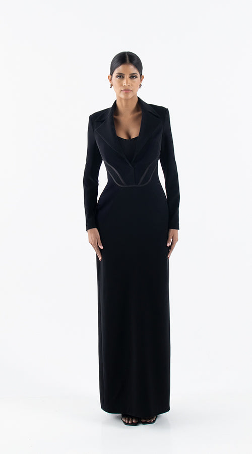 This black suit dress features a stylish maxi design with an open big kulah, perfect for a sophisticated and elegant look. Made with high-quality materials, this dress is both comfortable and fashionable. Elevate your wardrobe with this versatile piece, suitable for any occasion.