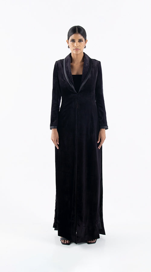 عزّزي خزانة ملابسك بمعطف فاخر من خام المخمل الذي يقترن بنطال ساتان أنيق. مصنوع من مواد عالية الجودة، يضفي هذا المعطف والبنطلون لمسة من الأناقة والرقي. مثالي لأي مناسبة رسمية أو خاصة، سيجعلك هذا الزي مميزًا ويشعرك بالثقة. ارتقِ بأسلوبك في الموضة مع فيلفا